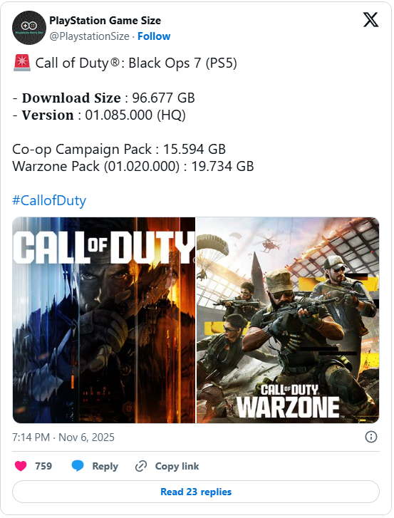 The size jump isn’t entirely surprising. Game content, modes, and asset quality have all escalated year-on-year. For context: previous entries like Black Ops 6 already had large installs, and Black Ops 7 continues that trend.