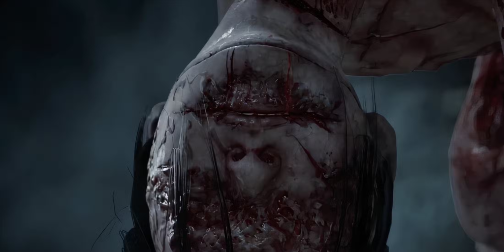 As mentioned previously, we have many repulsive and horrifying monsters we face throughout the course of the game. Some of these monsters are exactly what you’d expect from the Silent Hill series like the mannequin/ puppet esque ones but this new entry does bring some very unexpected monster designs, such as one that’s covered in mounds of flesh and births other monsters to overwhelm the player during a fight that somewhat resembles a man holding up a woman on his back while she gives birth. Coming from my own perspective as a concept artist, this game executes the monster designs perfectly. Every single monster is designed to represent a different part of Hinako’s trauma and outlook on the world and while playing you can easily tell visually what each is meant to be without needing the accompanying journal entries that share Hinako’s thoughts on each one, although it goes without saying that I’d highly recommend not skipping these entries.